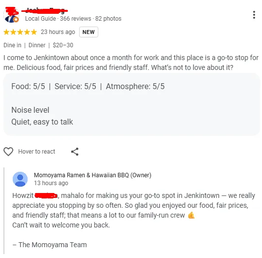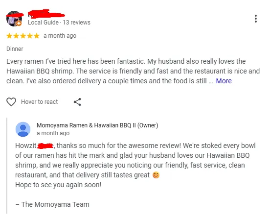Responding to reviews shows customers that your business is active and engaged. Regular responses can also improve your credibility and help strengthen your local search presence.